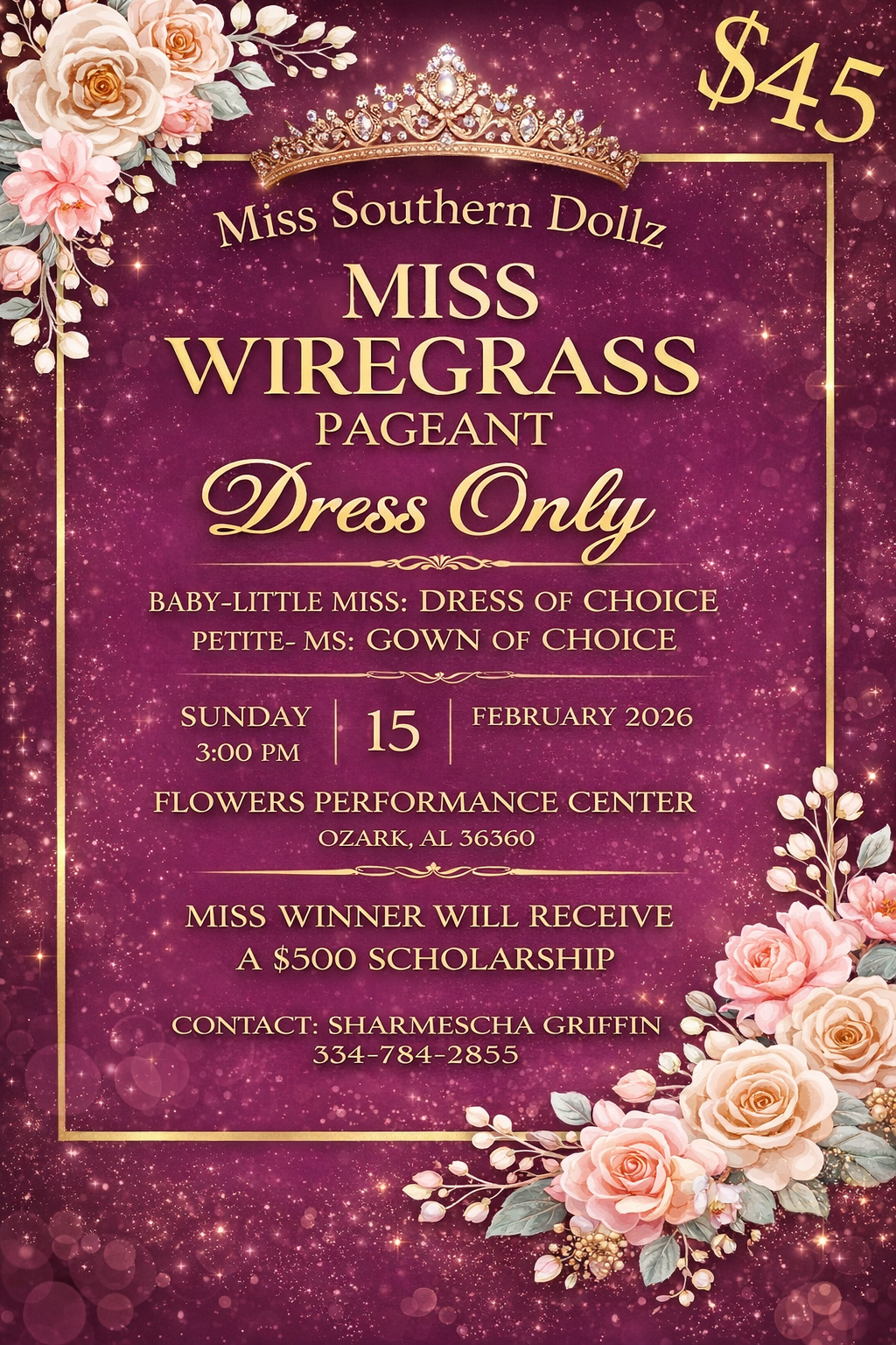 Entry Form https://form.jotform.com/sharmescha/miss-Wiregrass2026